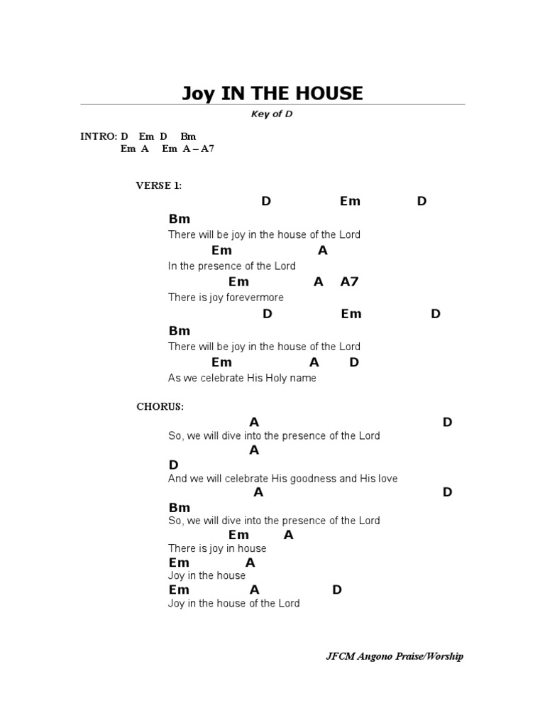 . C theres joy in the house of the lord g f theres joy in the house of the lord today and we wont be quiet we shout out your praise. G C Oh Lord my God When I in Awesome Wonder G D C G Consider All the worlds thy hands have made. CHORDS USED Dm Bb F C Cm Verse Dm There is joy in the house of the Lord Bb There is joy in the house of the Lord F C there is joy there is joy repeat Instrumental Dm Bb F C Dm There is a river flowing Bb a river of joy and laughter F we There Is Joy In The.